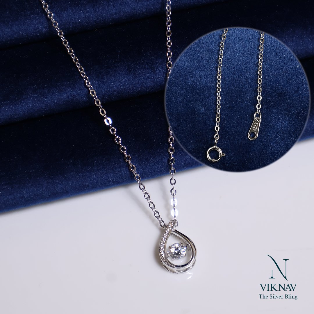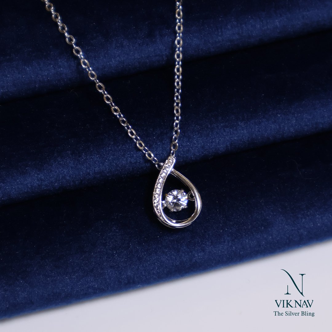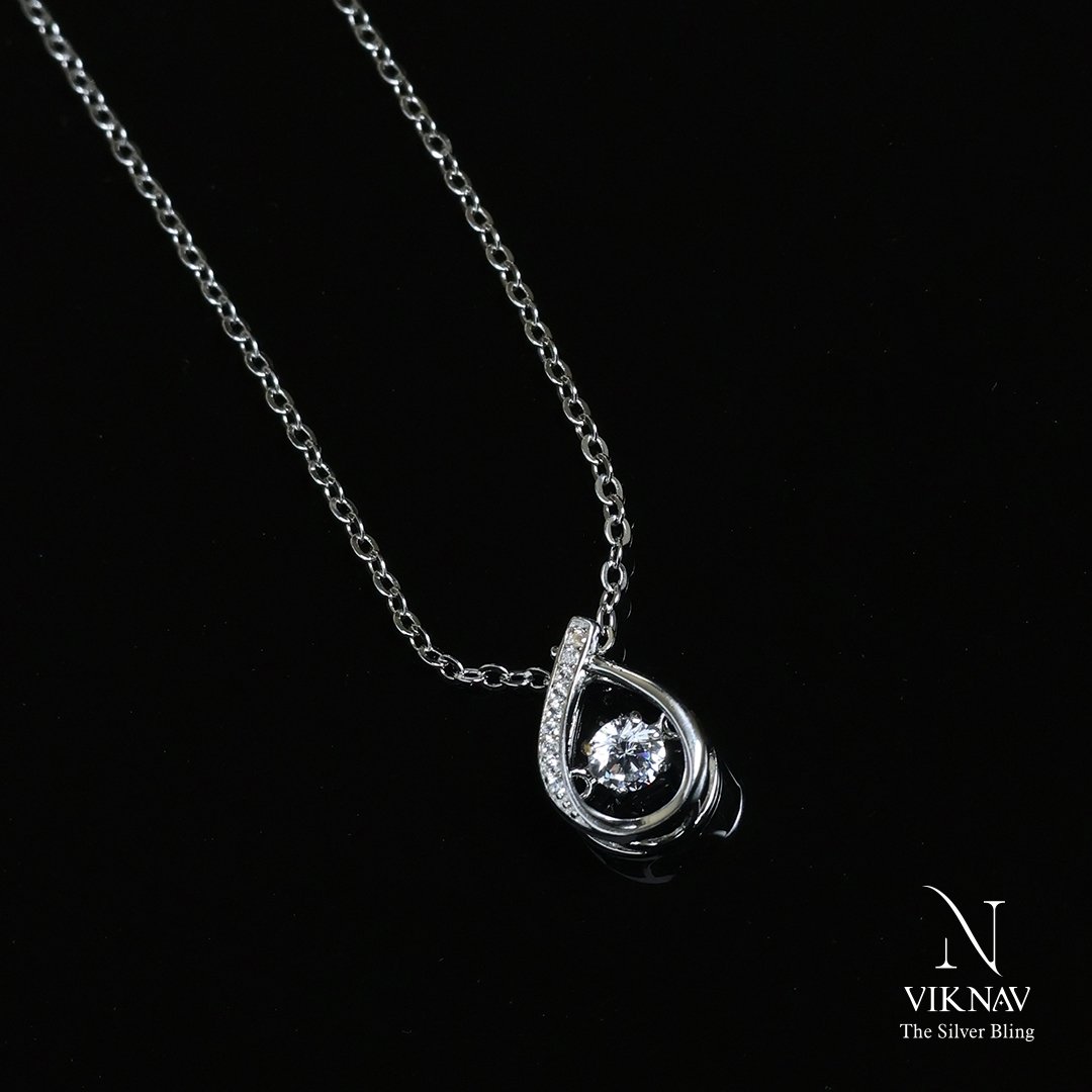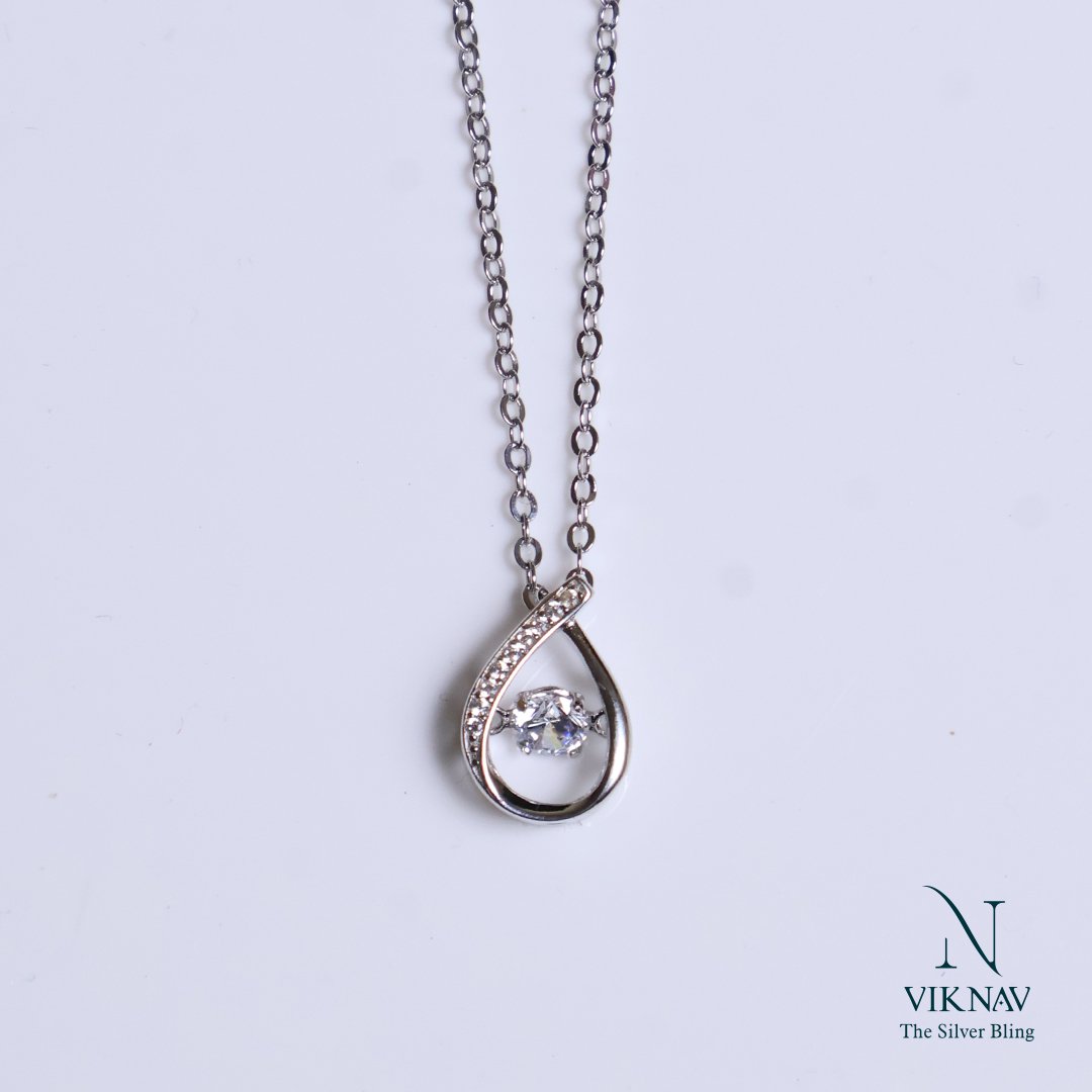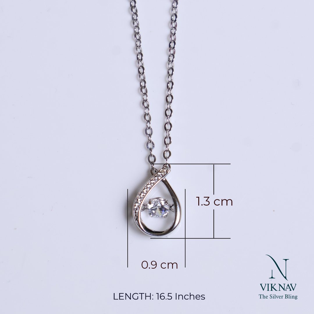 Captivate the eye with our exquisite Dancing Tear Drop Pendant Necklace, crafted from authentic 925 Sterling Silver, this piece combines classic elegance with mesmerizing motion. The design features a graceful, tear-drop shaped frame, subtly adorned with sparkling miniature stones along one side. At its heart lies a brilliant center stone uniquely set to move and shimmer with your every heartbeat and step-creating a dazzling effect unlike any other. This kinetic design, often called a "dancing stone," ensures that your necklace is constantly catching the light.