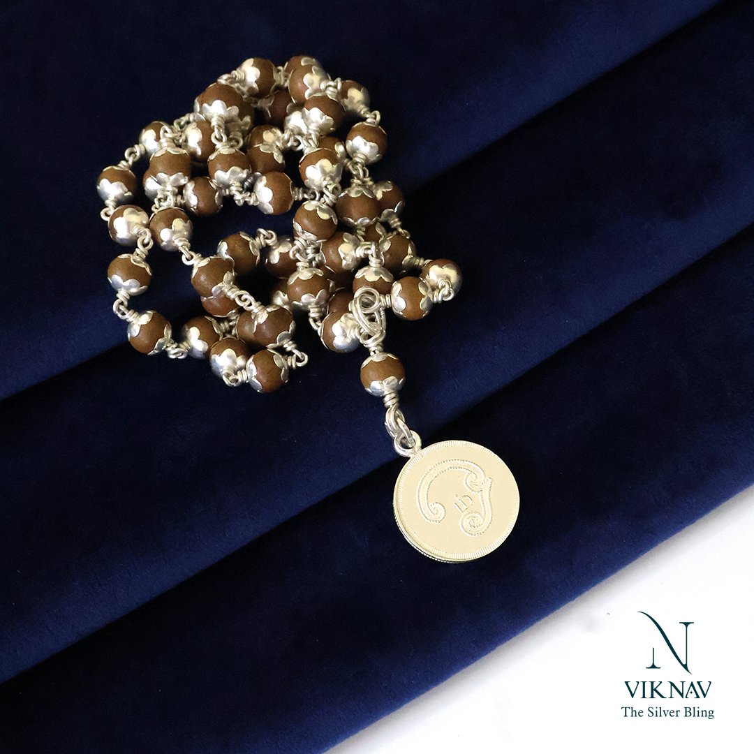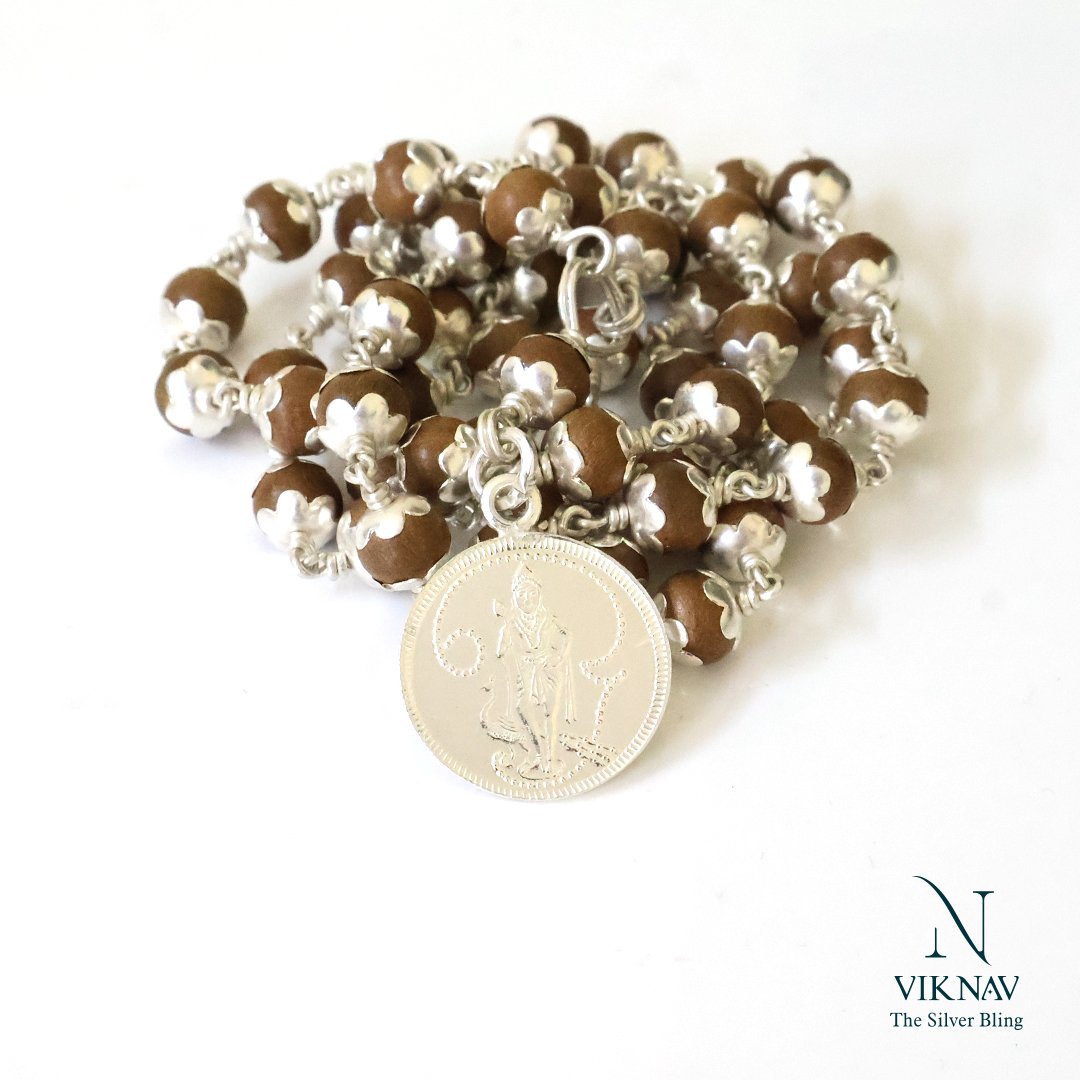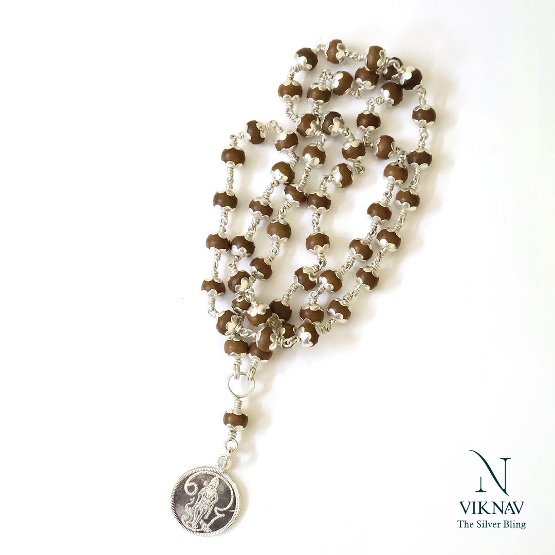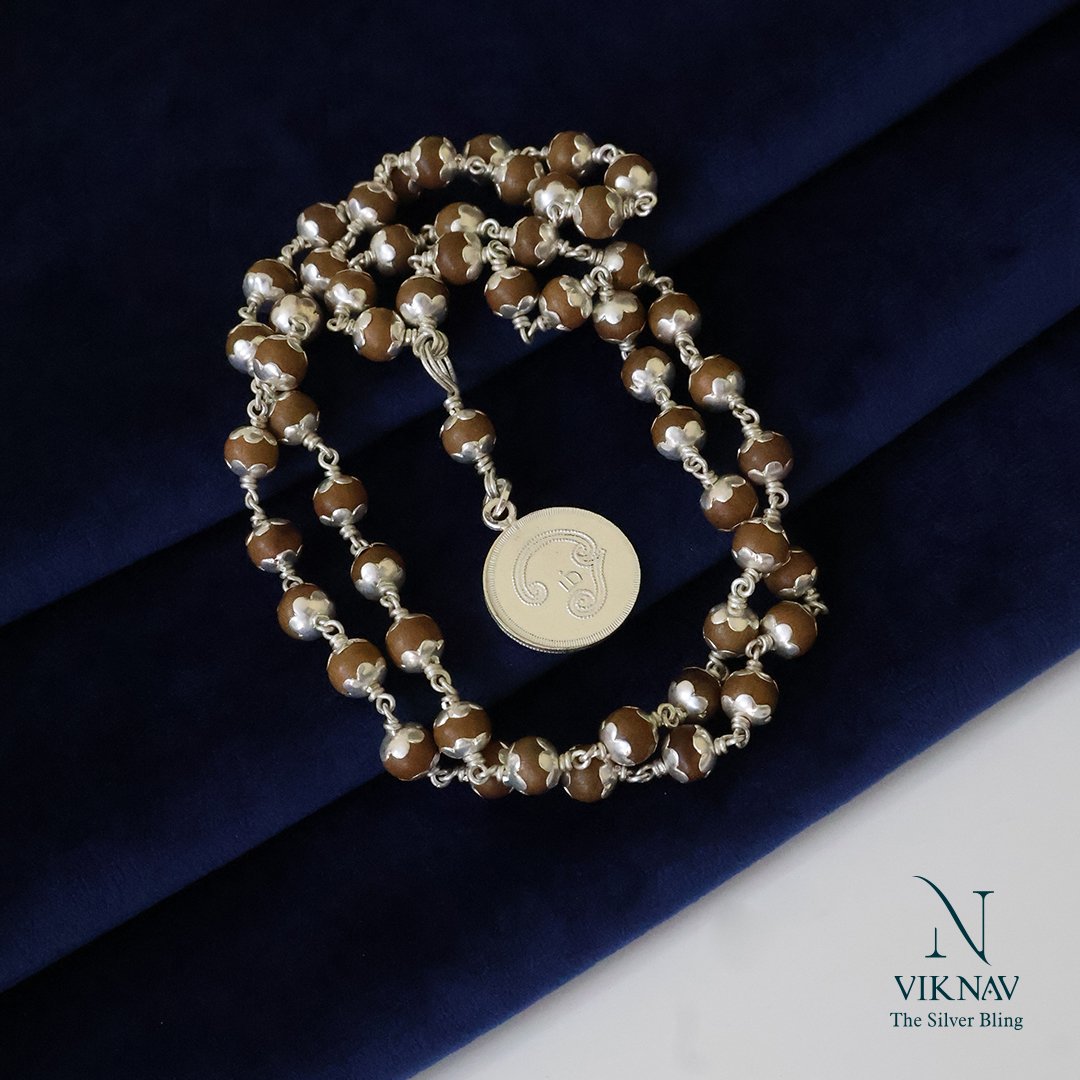 Immerse yourself in spiritual tranquility with this Handmade Divine Sandalwood (Chandanam) Maala, a sacred blend of tradition and craftsmanship. Each bead is carefully carved from natural sandalwood, known for its calming fragrance and spiritual significance. Accented with pure silver elements, this maala is ideal for japa (prayer), meditation, or as a divine accessory for daily wear. Its soothing aroma and elegant design make it a symbol of purity, devotion, and peace.