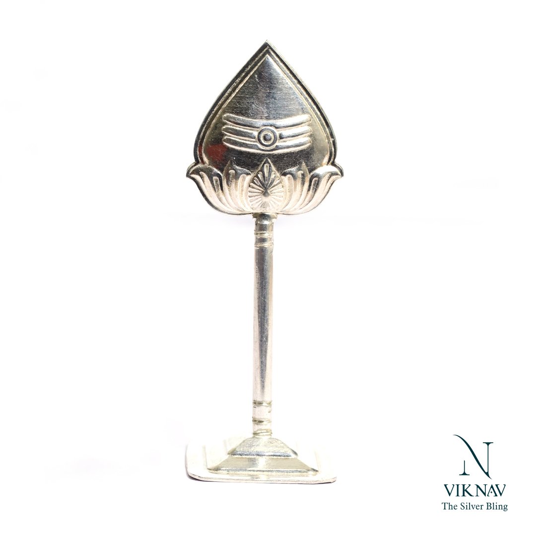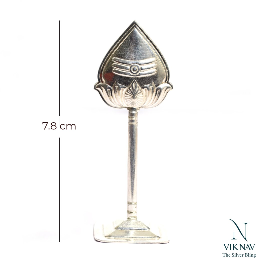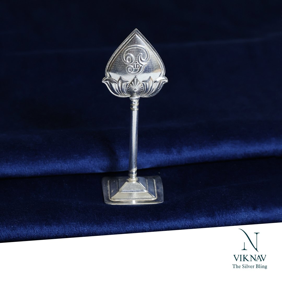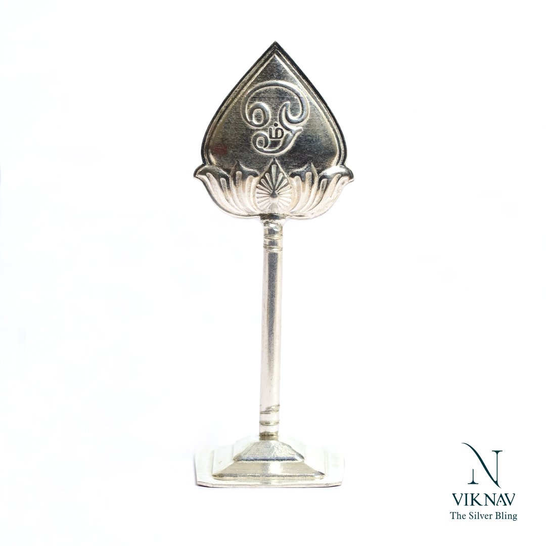 This elegantly crafted Silver Murugan Vel is a sacred symbol of Lord Murugan, designed with divine detail and traditional artistry. Handcrafted from Jewelry silver, this Vel sits gracefully on a sturdy base, making it perfect for home temples, pooja altars, or as a devotional gift. One side of the Vel features the sacred Tamil "Om" symbol, representing universal vibration and spiritual energy, while the other side showcases the Tripundra (three horizontal lines with a bindu) symbolizing Lord Shiva's blessings and spiritual knowledge. This Vel adorned with a stylized lotus base, enhancing the devotional appeal.