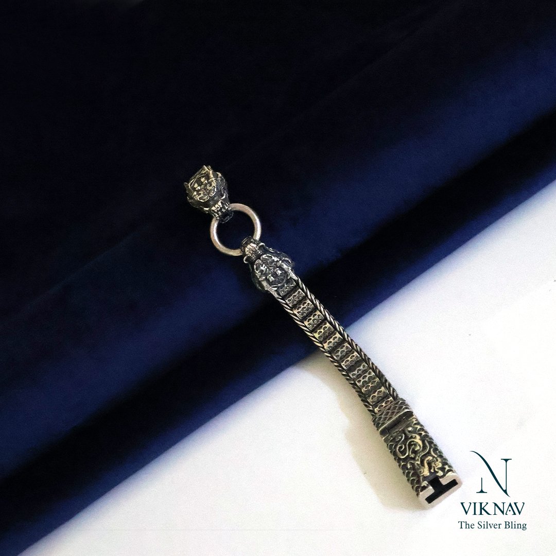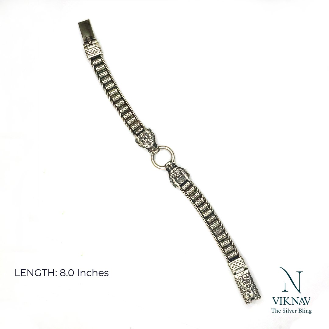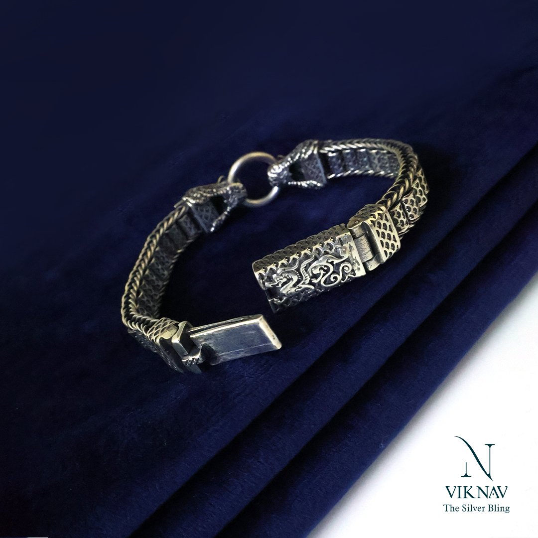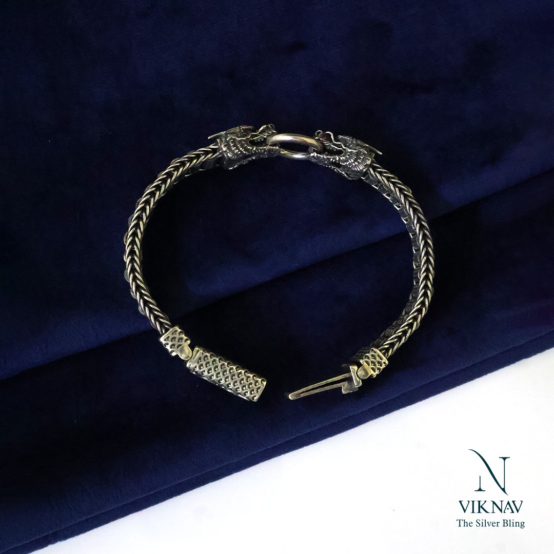 Unleash the legend. This striking 925 sterling silver bracelet features a pair of intricately carved dragon heads facing each other, locked in a powerful union by a bold circular clasp. The oxidised finish enhances every scale and pattern, giving the piece a rugged, antique depth. The chain itself boasts a detailed woven box-style design, blending ancient symbolism with masculine sophistication. Whether you wear it as a talisman of strength or a style statement, this bracelet speaks power, precision, and heritage.