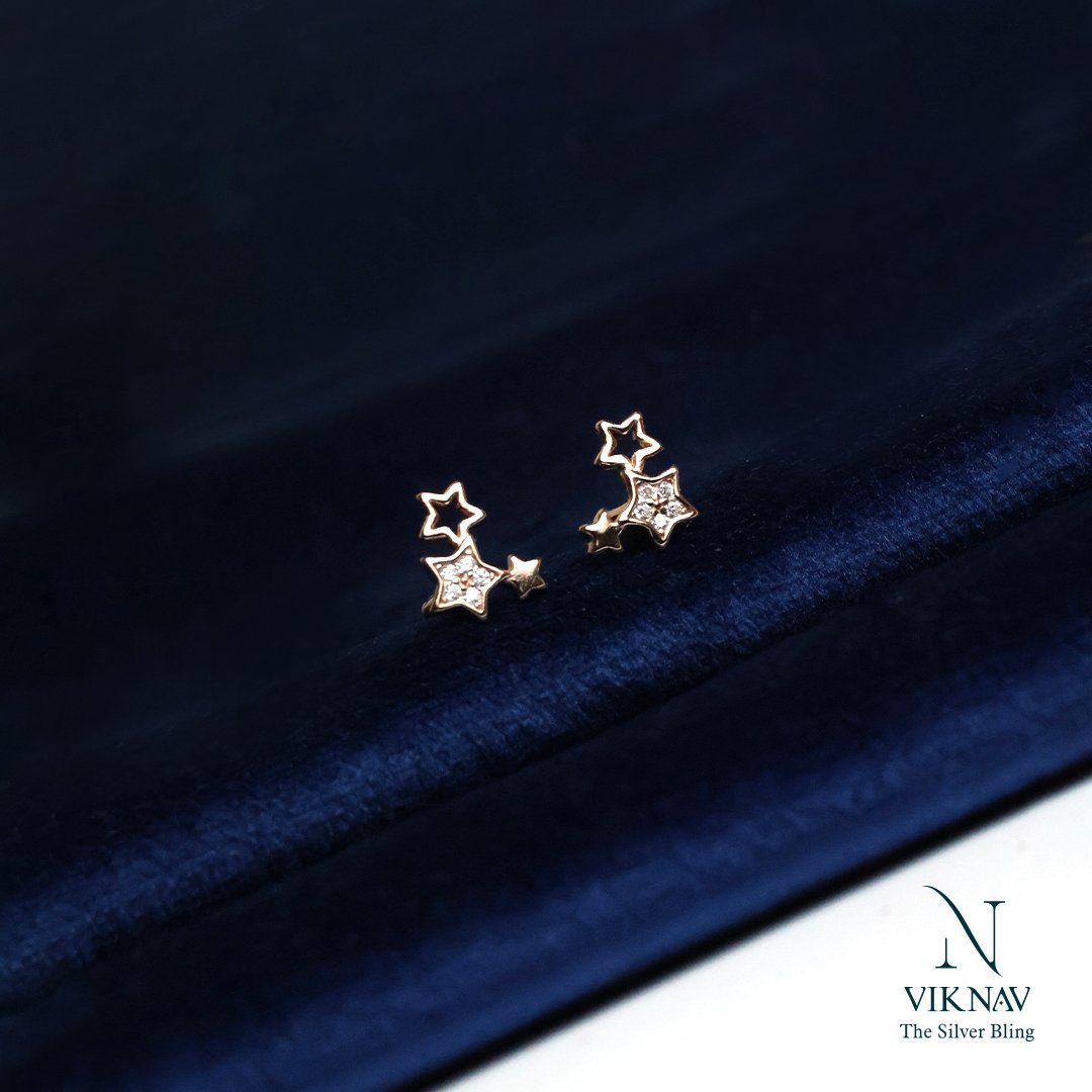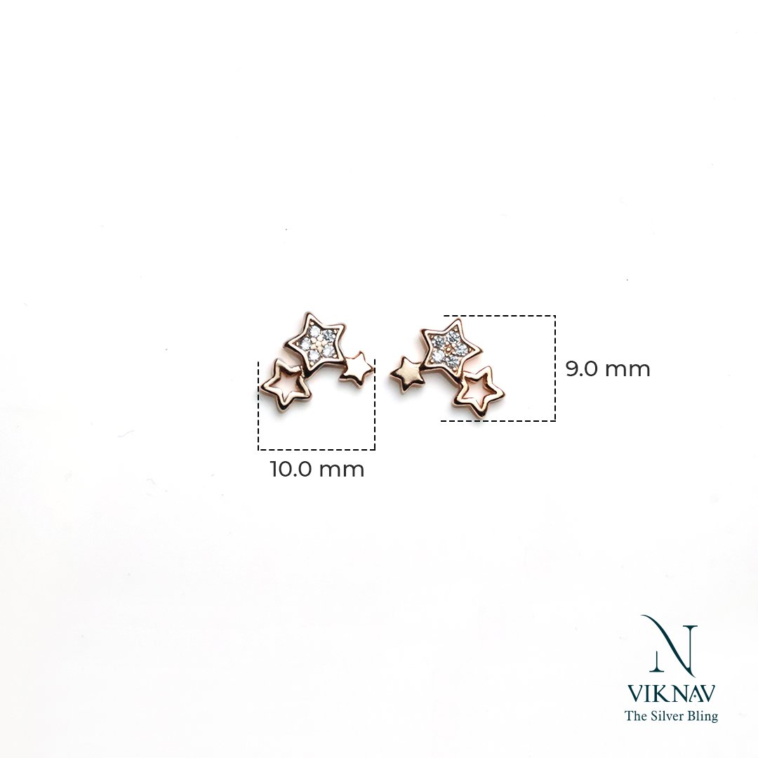 Add a touch of celestial charm with these elegant Triple Twinkle Studs. Crafted from premium 925 sterling silver and enhanced with a warm rose gold plating, each stud features a trio of delicate stars adorned with sparkling white stones. Perfectly petite and lightweight, these earrings bring a subtle yet captivating sparkle to your special occasions.