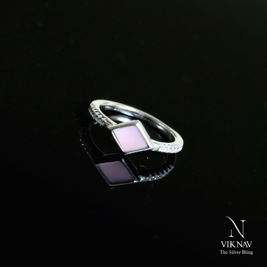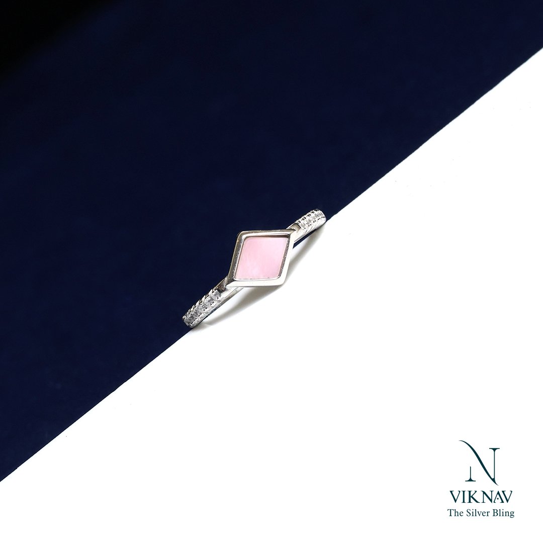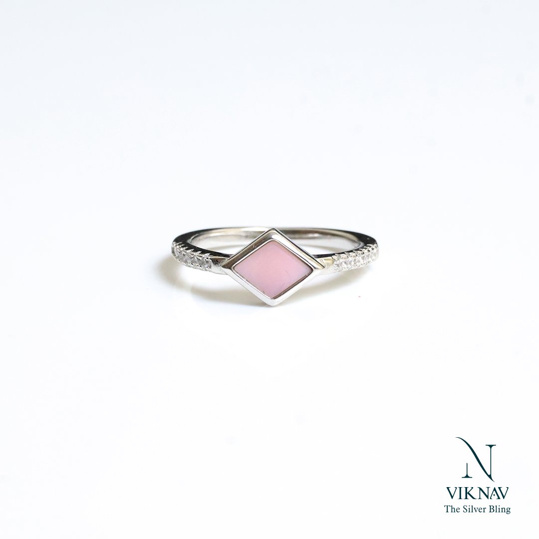 Delicate and graceful, the Rosy Spark Ring features a soft pink diamond-shaped enamel centerpiece, beautifully framed in high-polish 925 sterling silver. The sleek band is adorned with shimmering zircon accents on either side, adding just the right amount of sparkle. With its refined charm and feminine appeal, this ring is a lovely choice for everyday elegance or thoughtful gifting.
