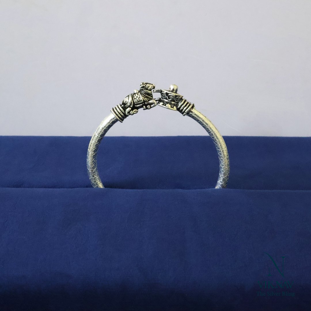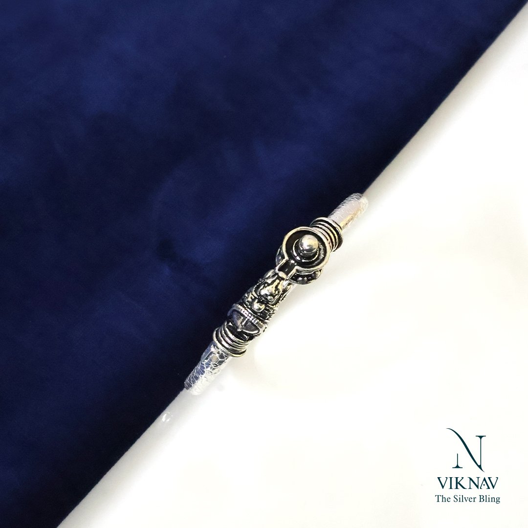 Embrace divine strength and unwavering devotion with the Shiva Linga with Nandi Kada, masterfully crafted in 925 sterling silver. This powerful men’s Kada features an intricately designed Shiva Linga—a sacred symbol of Lord Shiva's energy and creation—accompanied by Nandi, the devoted bull and eternal companion of Shiva, symbolizing loyalty, patience, and strength. With a bold structure and detailed oxidised finish, this Kada reflects spiritual depth and timeless craftsmanship. Designed for comfort and durability, it is perfect for those who seek a meaningful piece rooted in tradition and masculine elegance.