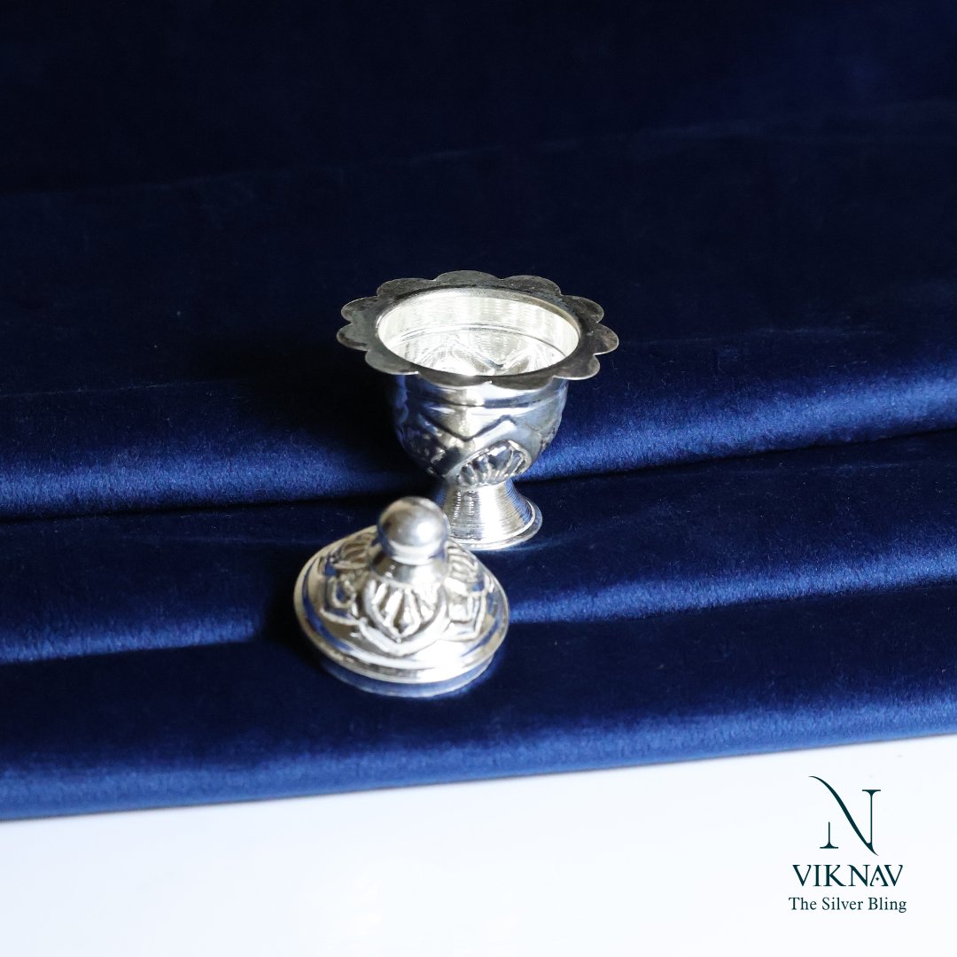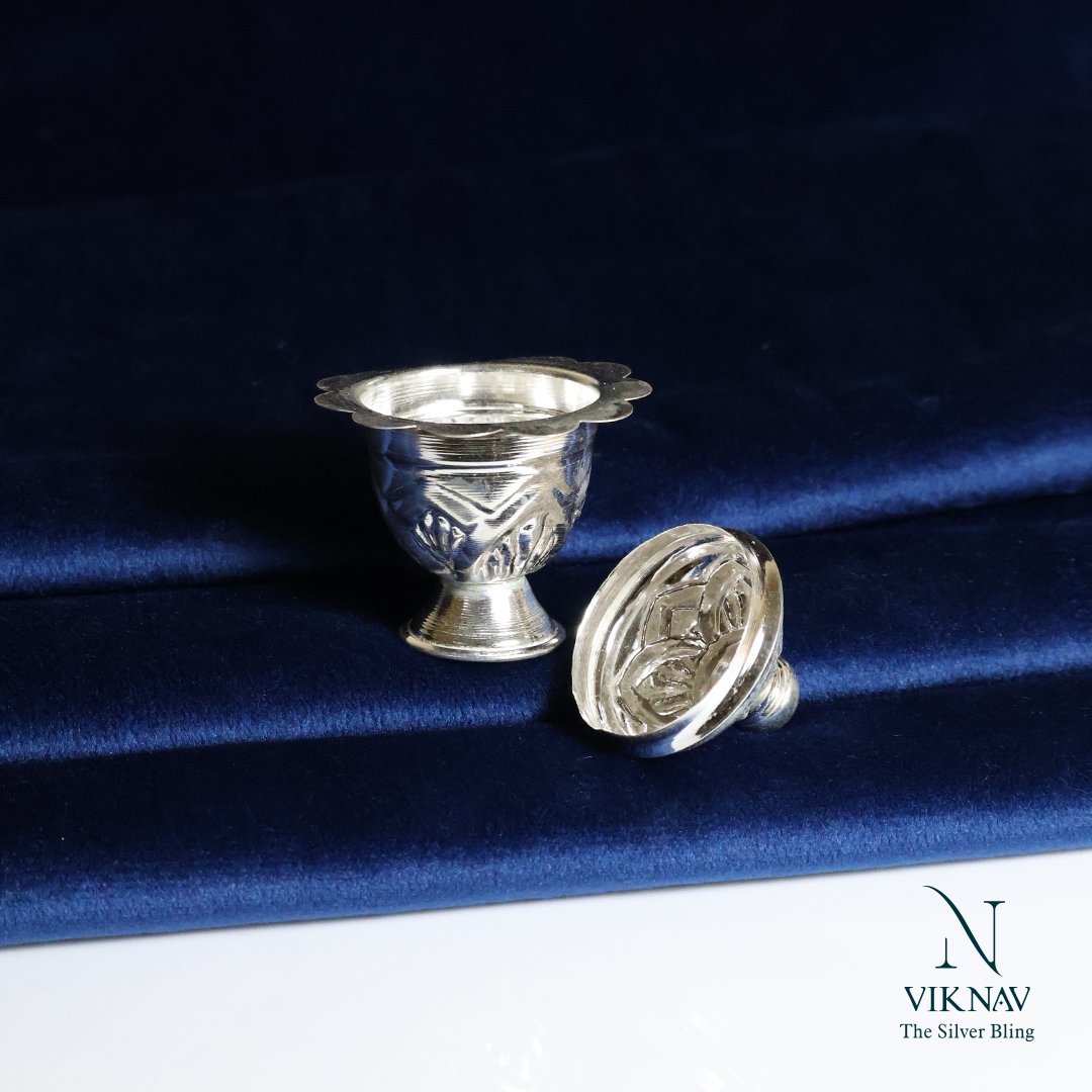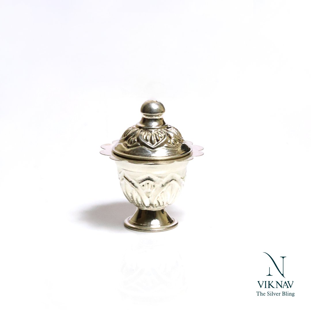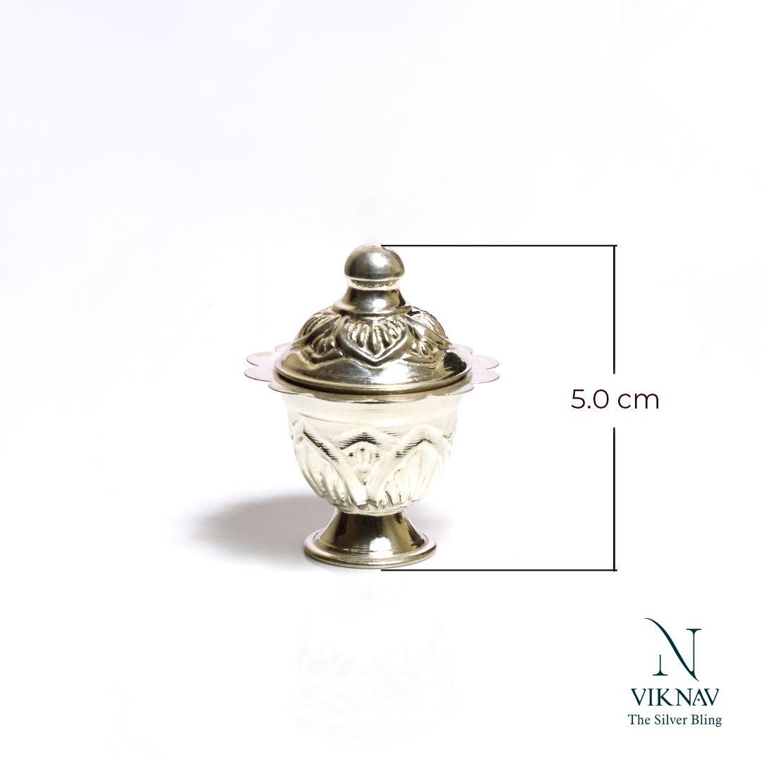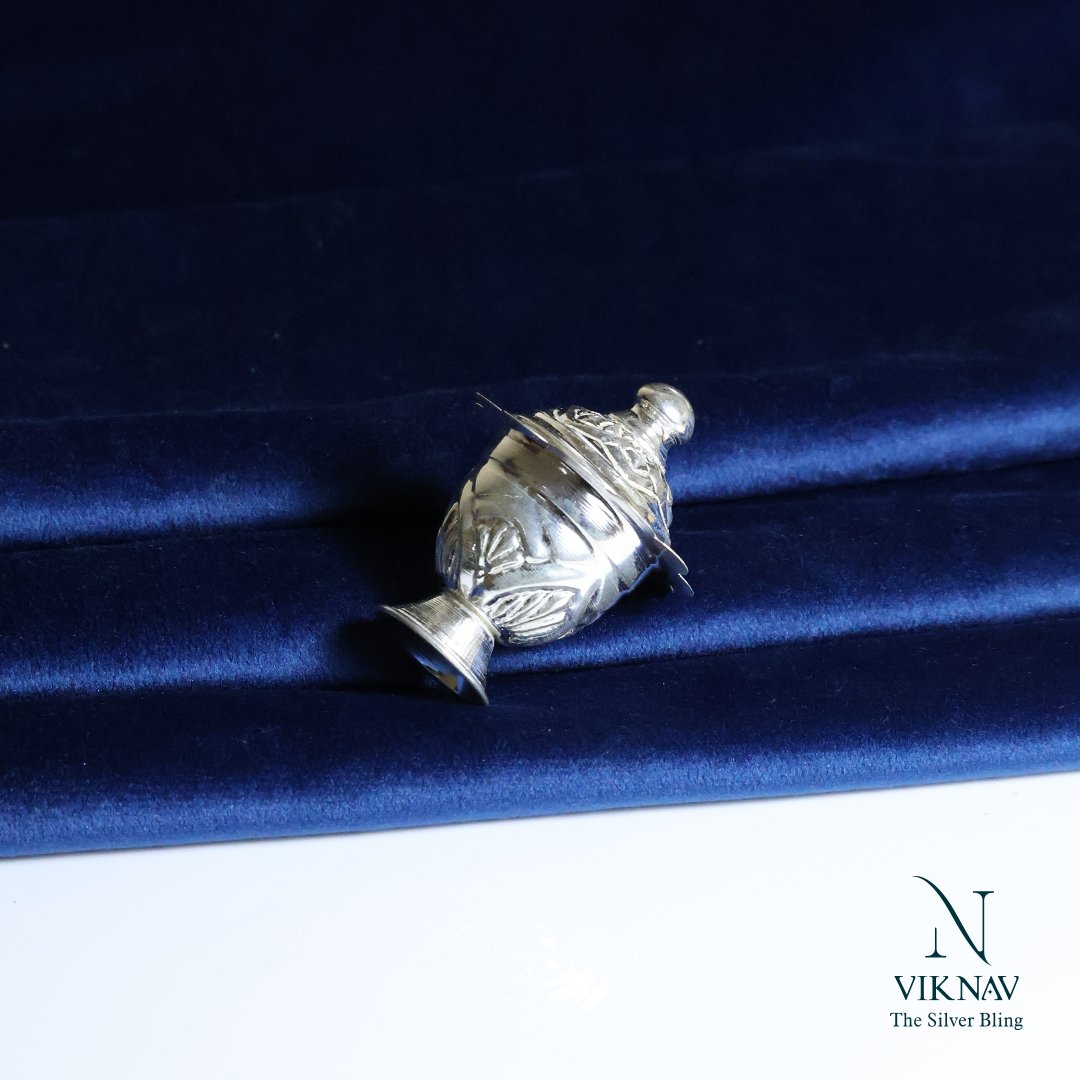 The Silver Sindhoor Box (also known as Silver Kunguma Chimizh) is a beautifully handcrafted container used to store sindhoor or kumkum, an essential part of traditional Indian rituals and daily worship. Made from Jewelry silver, this box not only serves a sacred purpose but also adds a touch of timeless elegance to your pooja space or vanity. Traditionally gifted during weddings, housewarming, or religious ceremonies, it is a symbol of marital bliss, devotion, and auspiciousness. Celebrate tradition with the enduring beauty of silver. The Silver Kunguma Chimizh is not just a container—it’s a vessel of grace, reverence, and divine symbolism.