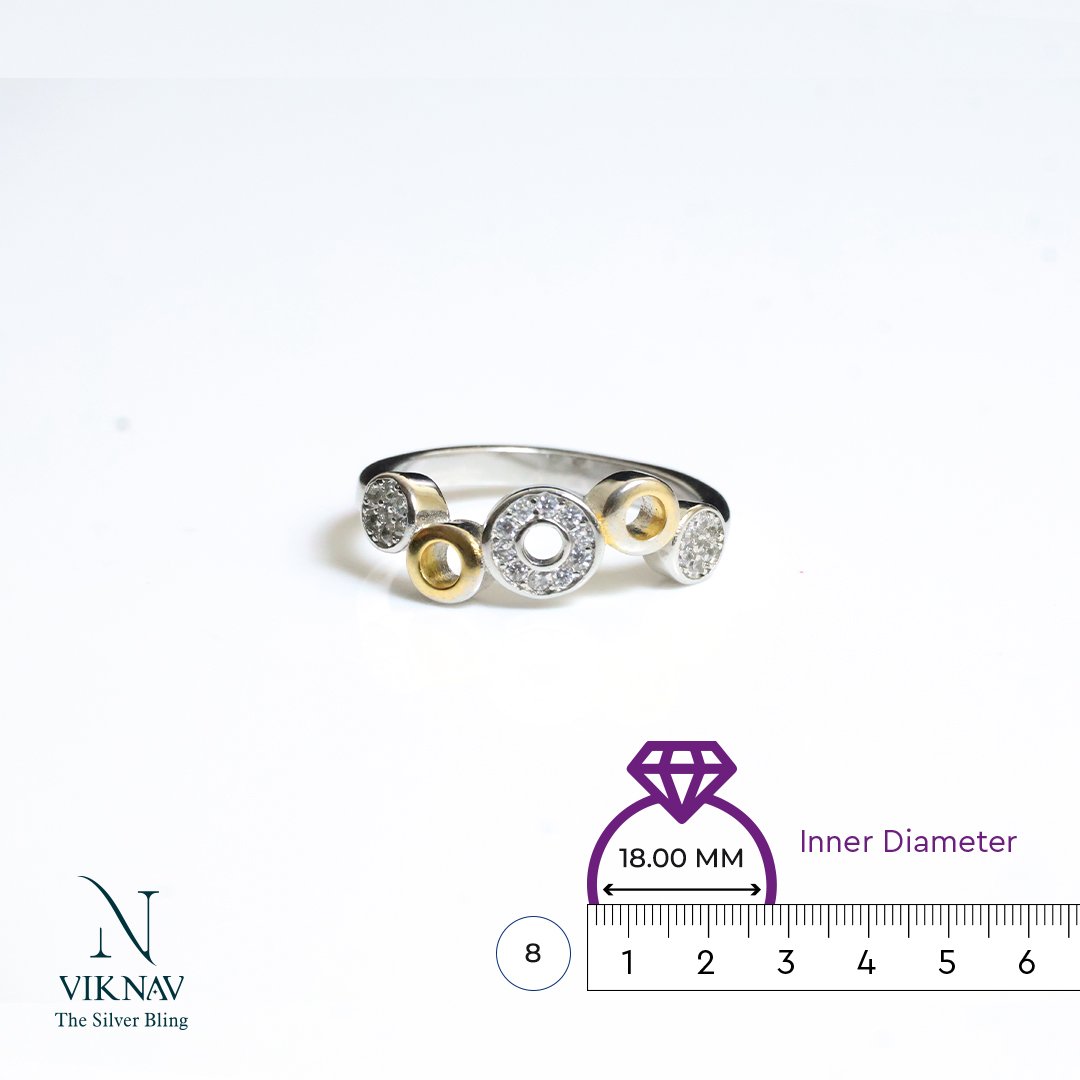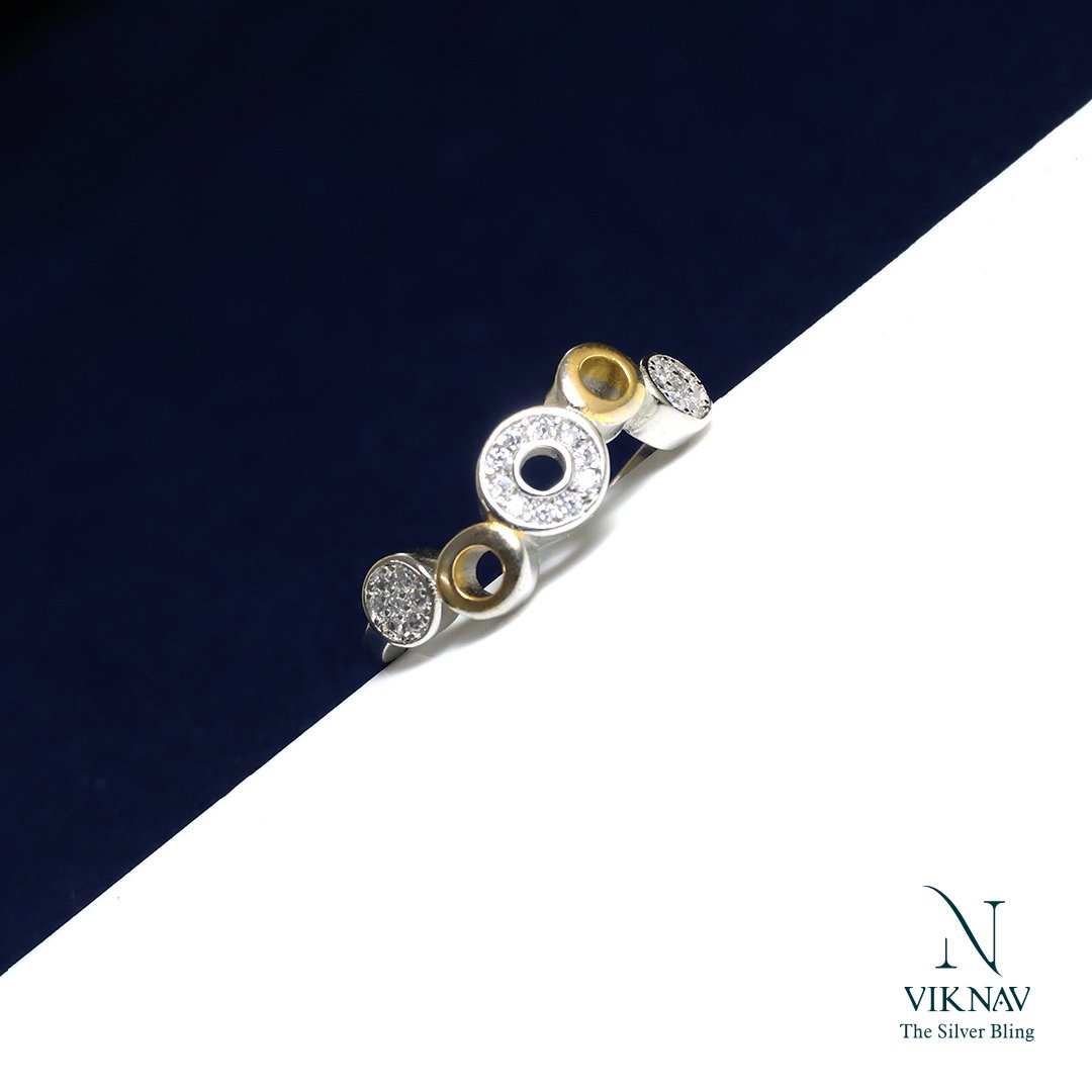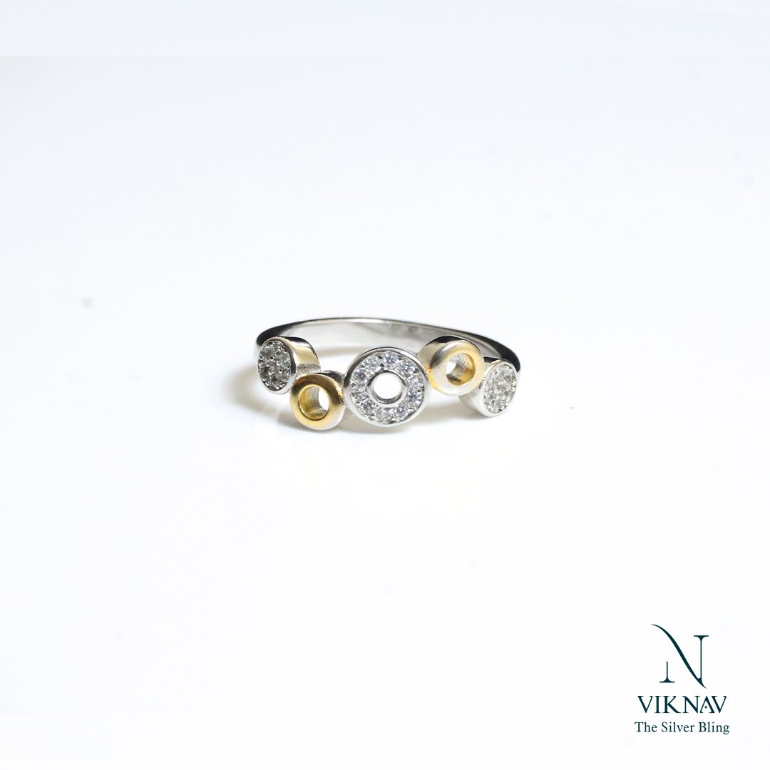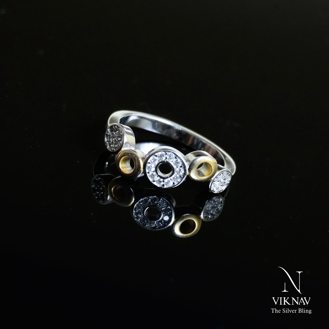 Elegant, artistic, and full of charm, the Wave Whirl Ring is a perfect fusion of modern design and timeless sparkle. Crafted in pure 925 sterling silver, this ring features alternating gold-toned and white stone circular motifs arranged in a rhythmic wave pattern. The central hollow circle adds a unique twist, making it a statement piece for any occasion.